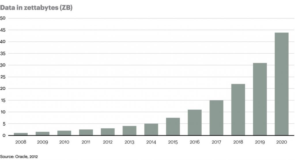 طبق تصویر زیر، برگرفته از سایت اوراکل این روند صعودی ذخیره دیتا تا سال ۲۰۲۰ پیش بینی شده که آمار خیره کننده ای داره.
